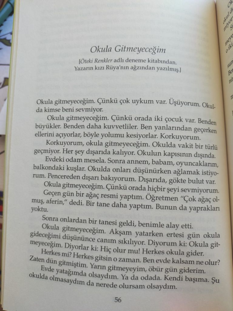 Orhan Pamuk yazma tutkusu, anlatma arzusunu çok çıplak bir deneyimde bize sunuyor. Kendimize bu kadar çıplak bakabilmek hepimiz için bu kadar mümkün olmayabilir. Öyle ki bu kitapta roman karakterlerinin öyküleri, anlatıları ile iç içe geçmiş bir metin var. Çoğu zaman bir şey anlatmanın yolu onu bir şeye benzetmektir hepimiz için. Bu şekilde çıplak kalmadan soyunabilecegimizi sanırız. Belki biraz öyle de olur. Şu kısa dört cümle beni etrafında hülyalı hülyalı döndürdü açıkçası “Okula gitmeyeceğim. Çünkü çok uykum var. Üşüyorum. Okulda kimse beni sevmiyor.”